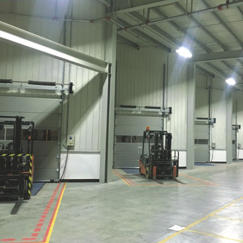 工业滑升门厂家的工业滑升门,该门借助弹簧平衡装置,利用小功率传动系统,沿墙体垂直提升或转折提升,占用左右空间小,上下启闭灵活。该门配置安全气囊保护,门体运行遇阻反弹;配有小门电器互锁装置,当小门打开时,断路开关切断控制电源,大门不能动作。配置防弹簧断裂和防钢绳断裂装置,用于弹簧、钢绳断裂时,卡住门体,门体不致砸落造成事故;电气控制配置了电机过载、过压过流保护,在过于频繁使用或有障碍卡阻时,电机自我保护,不强行运转造成烧毁,安全性能好。门板有聚氨发泡板和聚碳酸酯全透明板两种,具有良好的保温隔热性和采光性能。开门机上设有手电动转换装置,在停电时转换到手动开启。可根据客户要求设置采光窗,小门和配置遥控器。适用于工业车间,仓储、消防车库、机场物流、汽车4S店及大型厂房超大门体等。